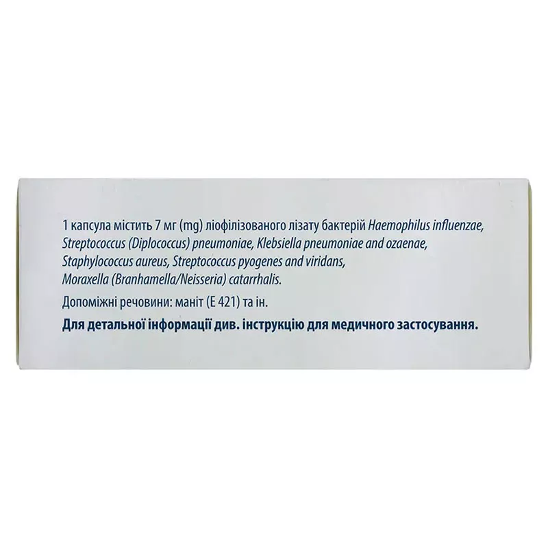 действующие вещества: 1 капсула содержит 7 мг лиофилизированного лизата бактерий Haemophilus influenzae, Streptococcus (Diplococcus) pneumoniae, Klebsiella pneumoniae and ozaenae, Staphylococcus aureus, Streptococcus pyogenes and viridans, Moraxella (Branhamella/Neisseria) catarrhalis;