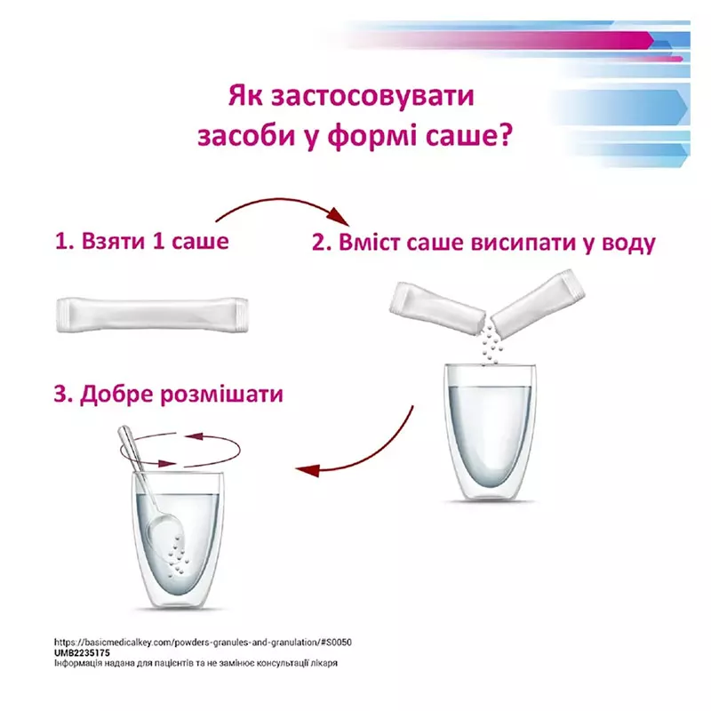 Перед применением содержимое одного саше растворяют в стакане воды. Желательно принимать во время или после еды.