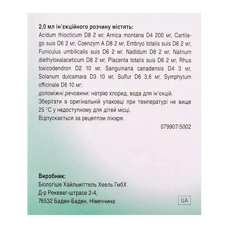 Действующие вещества: 2,0 мл раствора содержат: Acidum thiocticum D8 - 2 мг, Arnica montana D4 - 200 мг, Cartilago suis D6 - 2 мг, Coenzym A D8 - 2 мг, Embryo totalis suis D6 - 2 мг, Funiculus umbilicalis suis D6 - 2 мг, Nadidum D8 - 2 мг, Natrium diethyloxalaceticum D8 – 2 мг, Placenta totalis suis D6 - 2 мг, Rhus toxicodendron D2 - 10 мг, Sanguinaria сanadensis D4 - 3 мг, Solanum dulcamara D3 - 10 мг, Sulfur D6 - 3,6 мг, Symphytum officinale D6 - 10 мг;
