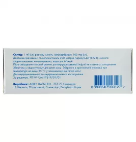 Вспомогательные вещества: полиэтиленгликоль 300, натрия гидросульфит (Е 223), кислота соляная концентрированная, вода для инъекций.