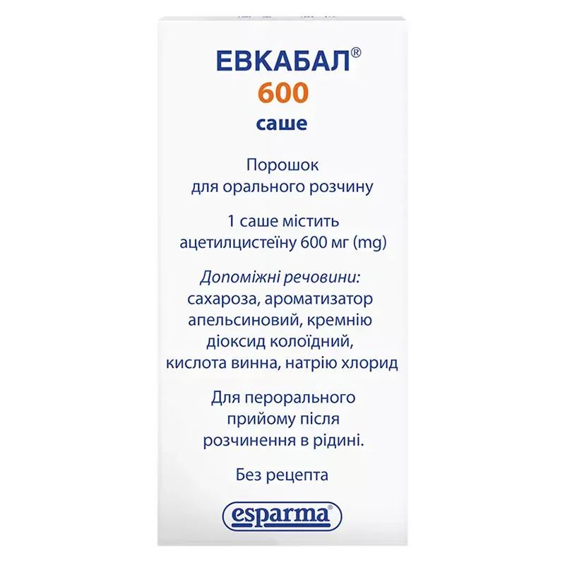 ЭВКАБАЛ® САШЕ (EUCABAL® SACHET)¶esparma R05C B01¶ACETYLCYSTEINUM¶¶ЭВКАБАЛ® САШЕ (EUCABAL® SACHET)¶СОСТАВ И ФОРМА ВЫПУСКА¶¶ЭВКАБАЛ® 200 САШЕ¶пор. д/оральн. р-ра 200 мг саше 3 г, № 20¶¶Ацетилцистеин 200 мг ¶№ UA/16272/01/01 от 04.09.2017 до 04.09.2022Без рецептаB¶¶ЭВКАБАЛ® 600 САШЕ¶пор. д/оральн. р-ра 600 мг саше 3 г, № 10, № 20¶¶Ацетилцистеин 600 мг ¶№ UA/16272/01/02 от 04.09.2017 до 04.09.2022Без рецептаB¶¶ФАРМАКОЛОГИЧЕСКИЕ СВОЙСТВА¶¶фармакодинамика. Ацетилцистеин — муколитическое, отхаркивающее средство, которое используется для разреживания мокроты при заболеваниях дыхательной системы, сопровождающейся образованием густой слизи.¶¶Ацетилцистеин оказывает выраженное муколитическое действие на слизистый и слизисто-гнойный секреты. Он уменьшает вязкость слизи и способствует отхаркиванию бронхиального секрета за счет деполимеризации мукопротеиновых комплексов и нуклеиновых кислот, которые являются причиной вязкости гиалинового и гнойного компонентов мокроты. Ацетилцистеин обладает также антиоксидантными и пневмопротекторными свойствами: снижение индуцированной гиперплазии мукоцитов, повышение производства сурфактантов за счет стимуляции пневмоцитов типа ІІ, стимуляция активности мукоцилиарного аппарата, что способствует улучшению мукоцилиарного клиренса.¶¶Ацетилцистеин оказывет прямое антиоксидантное действие за счет наличия нуклеофильной свободной тиольной группы (SH). Ацетилцистеин предотвращает инактивацию α-1-антитрипсина — фермента, который защищает ткани от энзимов воспалительных клеток, в первую очередь от эластазы фагоцитов.¶¶Кроме того, молекулярная структура ацетилцистеина дает ему возможность легко проникать через клеточные мембраны. Внутри клетки ацетилцистеин деацетилируется с образованием L-цистеина, незаменимой кислоты для синтеза глутатиона. Ацетилцистеин содействует повышению синтеза глутатиона, который является важным для детоксикации вредных факторов. Это объясняет действие ацетилцистина как антидота при отравлении парацетамолом.¶¶У больных с хроническими обструктивными заболеваниями легких прием 1200 мг ацетилцистеина в сутки на протяжении 6 нед приводил к значительному повышению объема вдоха и ФЖЕЛ (форсированной жизненной емкости легких).¶¶У больных с идиопатическим фиброзом легких (ИФЛ) применение ацетилцистеина перорально по 600 мг 3 раза в сутки на протяжении одного года в сочетании со стандартной терапией ИФЛ (преднизолон и азатиоприн) способствовало сохранению жизненной емкости легких (ЖЕЛ) и диффузной способности легких.¶¶Профилактический прием ацетилцистеина снижал частоту и серьезность бактериальных осложнений у пациентов с хроническим бронхитом/муковисцидозом. Антиоксидантное действие ацетилцистеина связано с выраженным снижением активности эластазы в мокроте, что является самым важным показателем функции легких у больных муковисцидозом. Даже при применении в очень высоких дозах (до 3000 мг ежедневно на протяжении 4 нед) у больных муковисцидозом ацетилцистеин не вызвал значительного токсического действия.¶¶Фармакокинетика. После перорального приема ацетилцистеин быстро и полностью всасывается. Он метаболизируется в печени с образованием фармакологически активного метаболита цистеина, а также диацетилцистеина, цистина и далее — смешанных дисульфидов. Биодоступность очень низкая — около 10%. Для различных лекарственн