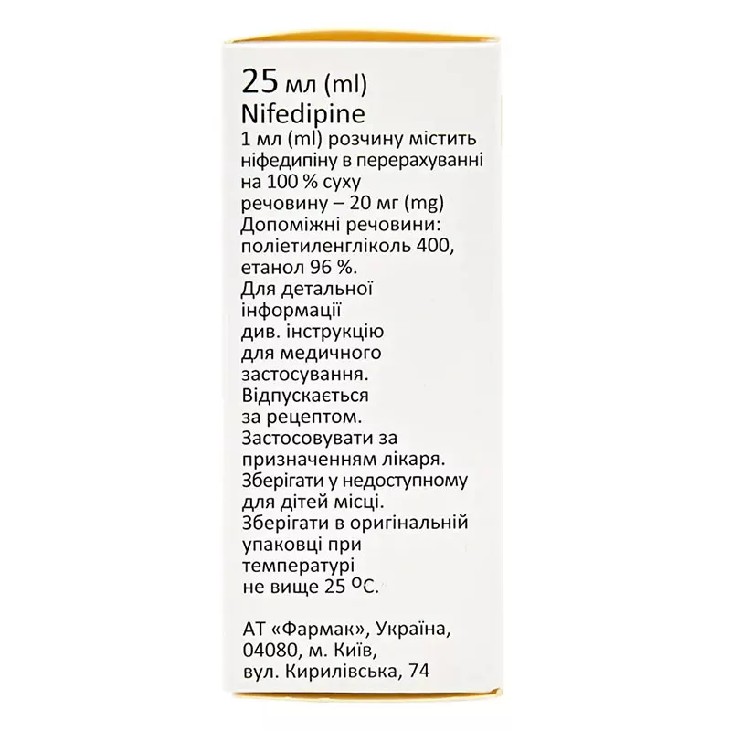 1 мл раствора содержит нифедипина в пересчёте на 100 % сухое вещество 20 мг (30 капель);