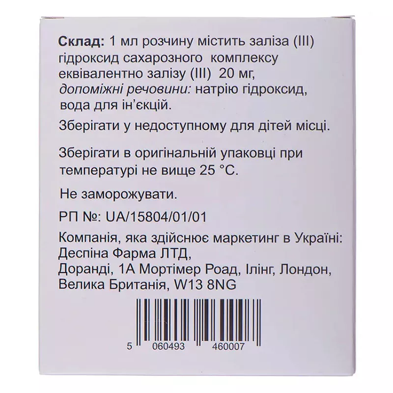 1 мл раствора содержит железа (III) гидроксид сахарозного комплекса эквивалентно железу (III) 20 мг;