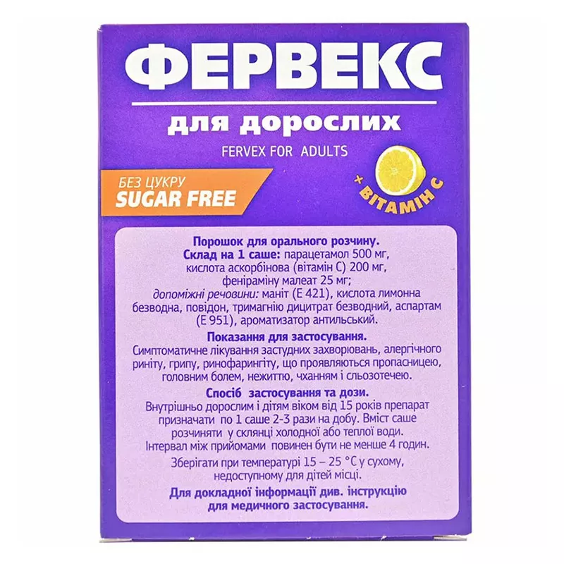 1 саше содержит: парацетамола 500 мг, аскорбиновой кислоты (витамина С) 200 мг, фенирамина малеата 25 мг;
