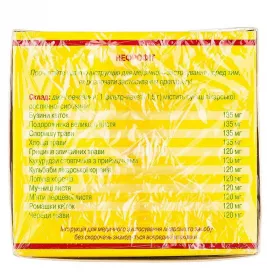 действующие вещества: 1 фильтр-пакет (1,5 г) содержит смесь лекарственного растительного сырья: бузины цветков(Sambuci flos) 135 мг, подорожника большого листьев (Plantaginis majoris folium) 135 мг, спорыша травы (Polygoni avicularis herba) 135 мг, хвоща травы (Equiseti herba) 135 мг, пастушьей сумки травы (Bursae pastoris herba) 120 мг, кукурузы столбиков с рыльцами (Zeae maydis styli cum stigmatis) 120 мг, одуванчика лекарственной корней (Taraxaci officinalis radix) 120 мг, лопуха корней (Arctii radix) 120 мг, толокнянки листьев (Uvae ursi folium) 120 мг, мяты перечной листьев (Menthae piperitae folium) 120 мг, ромашки цветков (Matricariae flos) 120 мг, череды травы (Bidentis herba) 120 мг.