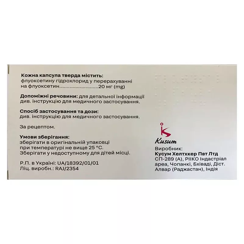 1 твердая капсула содержит флуоксетина гидрохлорид в перечислении на флуоксетин 20 мг;
