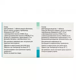 действующие вещества: 1 таблетка покрыта оболочкой, содержащая магния глутамата гидробромида (безводного) (МГГ) 75 мг; γ-аминомасляной кислоты (ГАМК) 75 мг; γ-амино-β-оксимасляной кислоты (ГАБОМ) 37 мг; витамина В6 (пиридоксина гидрохлорида) 37 мг;