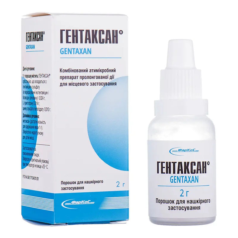 Гентаксан – комбінований антимікробний препарат пролонгованої дії для місцевого застосування, що містить аміноглікозид гентаміцину сульфат, кремній-органічний сорбент – поліметилсилоксан (метоксан) і сполуку цинку з триптофаном. Гентаміцину сульфат – антибіотик широкого спектра дії з бактерицидним ефектом, активний відносно патогенних грампозитивних мікроорганізмів – Staphylococcus aureus, streptococcus, Mycobacterium spp. і грамнегативних мікрорганізмів – Pseudomonas aeruginosa, Aerobacter aeruginosa, Escherichia coli, Proteus spp., Klebsiella spp., Serratia spp., Shigella spp., Salmonella spp., Citrobacter spp., Providenta spp., Yersinia spp. Поліметилсилоксан забезпечує сорбційно-дезінтоксикаційні властивості та разом з цинктриптофаном потенціює антибактеріальні ефекти антибіотика та підтримує протимікробну концентрацію антибіотика в рані на терапевтичному рівні протягом 8 діб. Аплікаційна терапія препаратом Гентаксан знижує на 2-3-тю добу кількість мікроорганізмів у рані до мінімального рівня (102-103 в