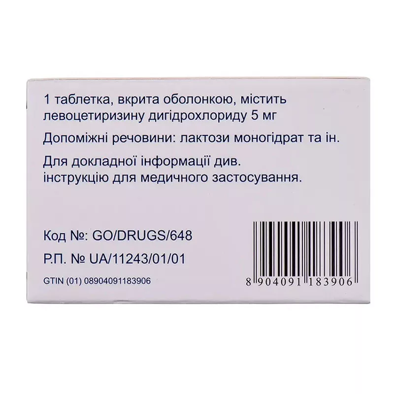 1 таблетка содержит левоцетиризина дигидрохлорида 5 мг;