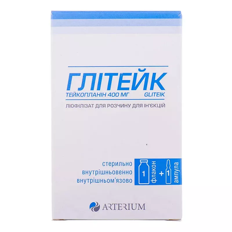 Глитейк – антибактериальный препарат для системного применения. Выпускается в виде лиофилизата для раствора для инъекций. 1 флакон лекарственного средства содержит 400 мг тейкопланина, который является действующим веществом. Отпускается только по рецепту врача.