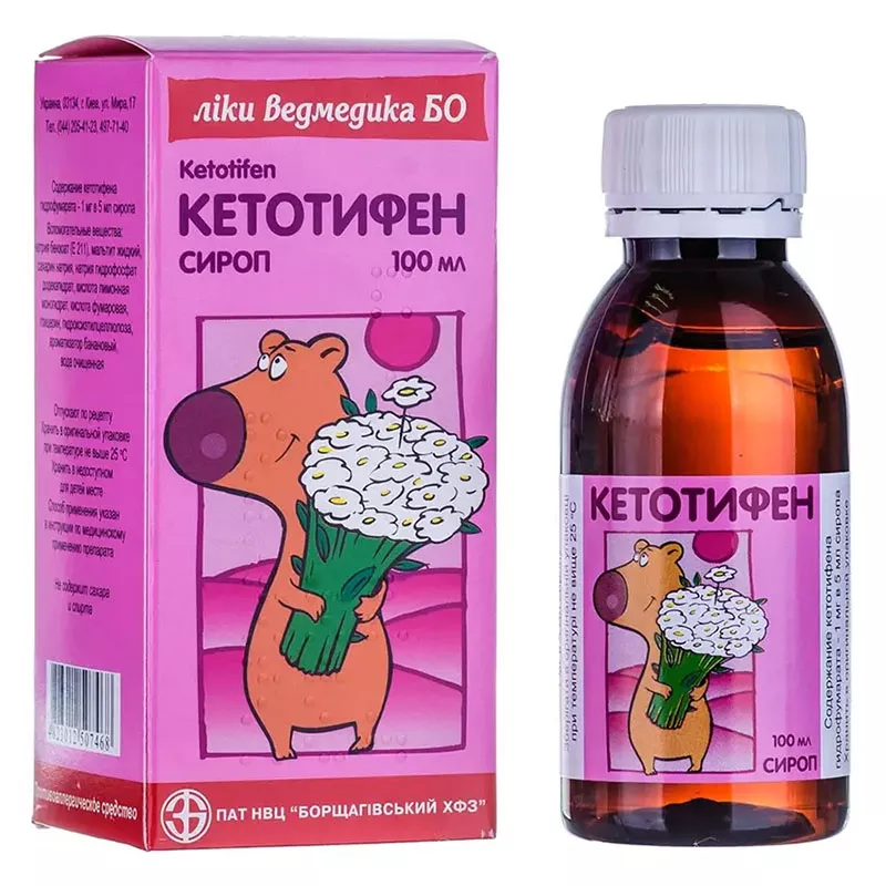 5 мл сиропа содержат 1 мг кетотифена гидрофумарата (в пересчете на кетотифен и 100 % сухое вещество);