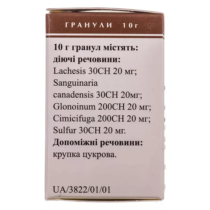 Действующие вещества: 10 г гранул содержат Lachesis 30CH 20 мг,