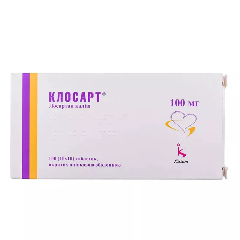 - Особенности КЛОСАРТ® таблетки Кусум Фарм C09C A01 LOSARTANUM СКЛАД І ФОРМА ВИПУСКУ табл. в/плівк. обол. 25 мг, № 84 табл. в/плівк. обол. 50 мг, № 84 табл. в/плівк. обол. 100 мг, № 14, № 28, № 30, № 84, № 100 Затверджено МОЗ Украiни від 2013-08-16 р. № 727. Р.п. № UA/8765/01/01, UA/8765/01/02, від 2015-01-15 р. № 11. Р.п. № UA/8765/01/03 ІНСТРУКЦІЯ для медичного застосування лікарського засобу Склад діюча речовина: losartan; 1 таблетка містить лосартану калію 25 мг, 50 мг або 100 мг; допоміжні речовини: целюлоза мікрокристалічна, натрію кроскармелоза, магнію стеарат, кремнію діоксид колоїдний безводний, Опадрай О3В 52014 жовтий*. *Опадрай О3В 52014 жовтий: заліза оксид жовтий (Е 172), хіноліновий жовтий (Е 104), гідроксипропілметилцелюлоза, поліетиленгліколь, титану діоксид (Е 171). Лікарська форма Таблетки, вкриті плівковою оболонкою. Основні фізико-хімічні властивості: круглі двоопуклі таблетки, вкриті плівковою оболонкою жовтого кольору. Фармакотерапевтична група Прості препарати антагоністів ангіотензину ІІ. Код АТХ С09С А01. Фармакологічні властивості Фармакодинаміка. Лосартан калію — антагоніст рецепторів ангіотензину II (типу АТ1). Ангіотензин II, що утворюється з ангіотензину I під час реакції з участю ангіотензинперетворювального ферменту (АПФ, кінінази II), є потужним вазоконстриктором, первинним вазоактивним гормоном ренін-ангіотензинової системи та важливим компонентом патофізіологічних механізмів артеріальної гіпертензії. Ангіотензин II також зв’язується з рецептором АТ1, який знайдено у багатьох тканинах (гладеньких м’язах судин, надниркових залозах, нирках і серці), визначаючи низку важливих біологічних ефектів, у тому числі вазоконстрикцію і звільнення альдостерону. Ангіотензин ІІ також стимулює проліферацію гладком’язових клітин. Лосартан та його активний метаболіт карбоксильна кислота блокують усі фізіологічно вагомі впливи ангіотензину ІІ незалежно від джерела або шляху синтезу. Лосартан селективно зв’язується з рецептором АТ1, не зв’язується і не блокує інші рецептори гормонів або іонні канали. Більше того, лосартан не пригнічує АПФ (кініназу ІІ) — фермент, який сприяє розпаду брадикініну. Унаслідок цього ефекти, безпосередньо не пов’язані з блокадою рецептора АТ1, такі як посилення впливів, медіатором яких є брадикінін, не асоційовані із застосуванням лозартану. Під час застосування лосартану усунення негативної оборотної реакції ангіотензину ІІ на секрецію реніну призводить до підвищення активності реніну у плазмі крові. Таке підвищення активності призводить до зростання ангіотензину ІІ у плазмі крові. Хоча відбувається таке зростання, антигіпертензивна активність і супресія концентрації альдостерону у плазмі крові зберігаються, що свідчить про ефективну блокаду рецепторів ангіотензину ІІ. Після відміни лосартану активність реніну у плазмі крові і показники рівнів ангіотензину ІІ протягом 3 днів повертаються до початкових значень. Як лосартан, так і його основний метаболіт мають вищу спорідненість до АТ1 рецепторів, ніж АТ2. Активний метаболіт у 10–40 разів активніший, ніж лосартан. Фармакокінетика. Після перорального прийому лосартан добре абсорбується та зазнає метаболічних перетворень першого проходження. Системна біодоступність препарату приблизно становить 33\%. Майже 14\% пероральної дози лосартану перетворюється на активний карбоксильний метаболіт. Максимал
