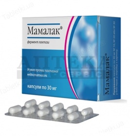 - Особенности Мамалак 30мг N30 капсулы Состав 1 капсула Мамалак содержит действующего вещества: фермент лактаза - 30 мг; (3000 ед.) Показания Мамалак быстро и эффективно блокирует симптомы лактазной недостаточности и улучшает качество пищеварения. Противопоказания Индивидуальная непереносимость (в том числе известная гиперчувствительность) лактазы и других веществ, входящих в состав Мамалака. Способ применения и дозы Мамалак рекомендуется употреблять как добавку к рациону молочного питания у детей и взрослых с непереносимостью молока, обусловленной лактазной недостаточностью. У детей в возрасте до 2 лет: содержимое 1 капсулы по 7,0 мг растворить в 100 мл первой порции сцеженного молока или молочной смеси. Начать употребление через несколько минут. У детей в возрасте от 2 до 7 лет: содержимое 1–3 капсул по 30,0 мг добавить в теплое (от 30–40 °С) молоко или молочную смесь. Если ребенок может проглотить капсулу, тогда используют 1–3 капсулы непосредственно перед употреблением молочного питания. У детей в возрасте от 7 лет и старше: 3–5 капсул перорально непосредственно перед употреблением молочного питания. Употреблять по назначению врача. Передозировка Нет информации о передозировке препаратом. Побочные эффекты Не зафиксировано проявление побочных эффектов от приема Мамалака. Применение при беременности Используется в период лактации. Условия хранения В сухом, защищенном от света месте при температуре от 2 до 25 °С.