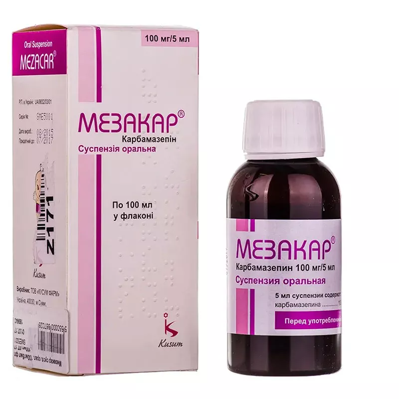 Действующие вещества у препарата "Мезакар суспензия 100 мг/5 мл по 100 мл во флаконе 1 шт." являются Карбамазепин.