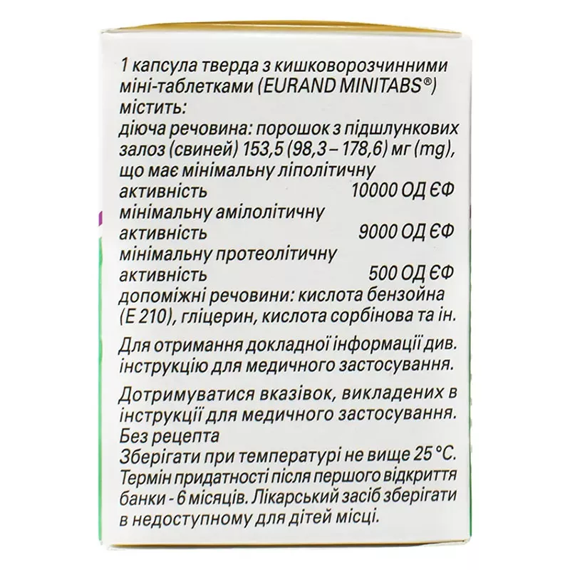 Мини-таблетки высвобождаются из растворимых капсул еще в желудке, где равномерно перемешиваются с пищевыми массами. В желудке оболочка мини-таблеток, устойчивая к действию желудочного сока, защищает чувствительные к кислоте ферменты от инактивации соляной кислотой. Лишь после достижения нейтральной или слабощелочной среды в тонкой кишке ферменты высвобождаются после растворения оболочки. В связи с тем, что порошок из поджелудочной железы не всасывается в пищеварительном тракте, сведения о его фармакокинетике и биодоступности отсутствуют.
