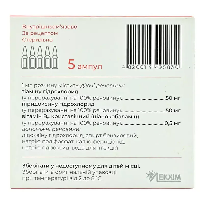 1 мл тиамина гидрохлорида (в пересчете на 100 % вещество) 50 мг, пиридоксина гидрохлорида (в пересчете на 100 % вещество) 50 мг, витамина В12 кристаллического (цианокобаламина) (в пересчете на 100 % вещество) 0,5 мг