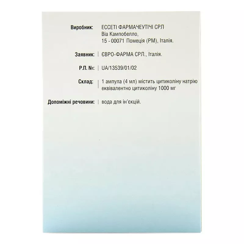 1 ампула (4 мл) содержит цитиколина натрия эквивалентно цитиколинe 500 мг или 1000 мг;