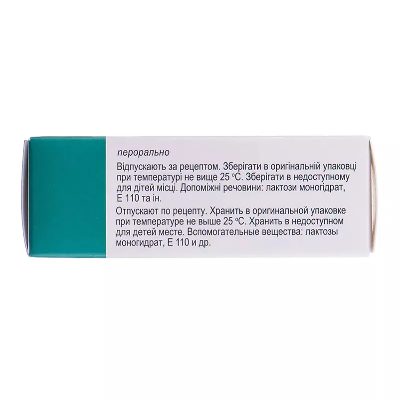 Вспомогательные вещества: крахмал картофельный, лактозы моногидрат, кальция стеарат, кремния диоксид коллоидный безводный, тальк; пленочное покрытие 85F35260 Opadry II Red: спирт поливиниловый частично гидролизованный, макрогол, тальк, титана диоксид (Е 171), специальный красный АG (Е 129), желтый закат FCF (Е 110).