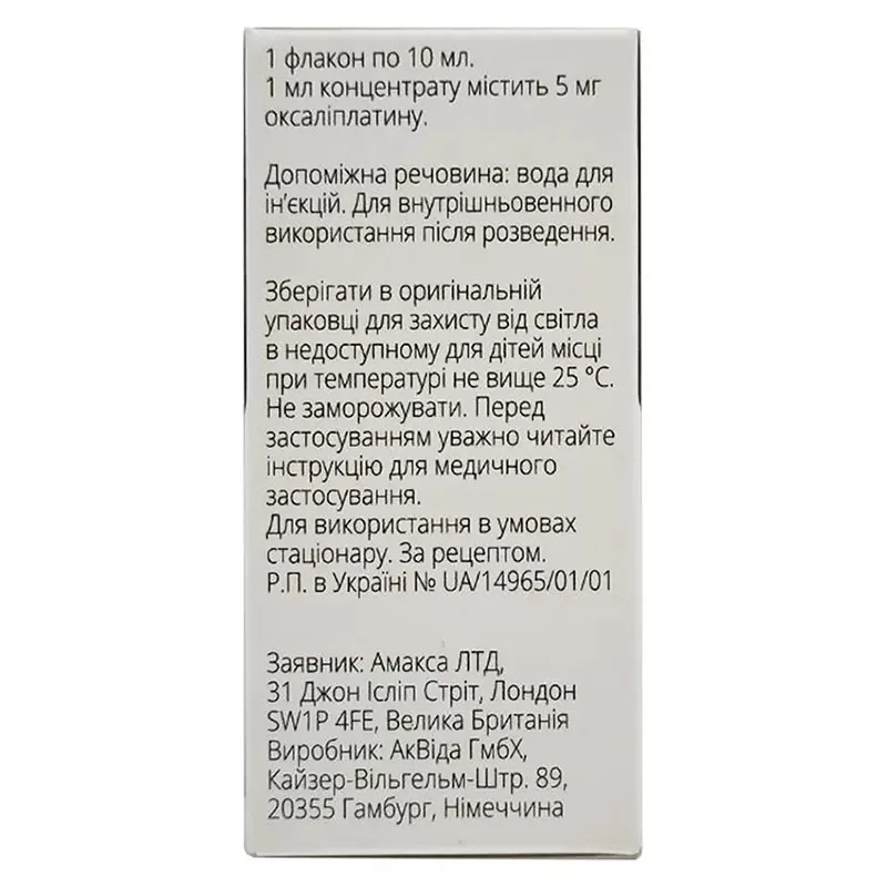 Оксалиплатин Амакса представляет собой единственный энантиомер (SP-4-2)-[(1R,2R)-циклогексан-1,2-диамин-kN, kN¢] [этандиоат(2-)-kО1, кО2] платины.