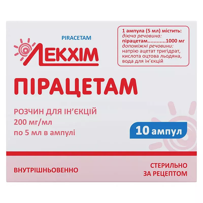 Пирацетам раствор для инъекций 200 мг/мл в ампуле по 5 мл 10 шт. - Лекхим