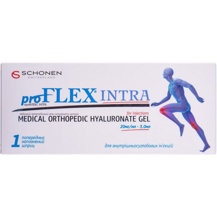 проФЛЕКС ИНТРА содержит гиалуронат натрия, синтезированный и структурированный методами биоинженерии из метаболитов стрептококковой ферментации, который обладает высокой вязкоэластичностью, смазочной способностью, физической изменчивостью и высокой биосовместимостью. проФЛЕКС ИНТРА — стерильный, свободный от пирогенов, аллергенов, генетической токсичности и не оказывает раздражающего действия на кожу. проФЛЕКС ИНТРА может быть использован как ортопедический имплантат для улучшения функции суставов. При использовании в виде инъекций в полость сустава проФЛЕКС ИНТРА объемно замещает синовиальную жидкость, стимулирует синовиальную оболочку производить собственный высокомолекулярный гиалуронат, который повышает подвижность сустава, действует как амортизатор, облегчает боль, уменьшает проявления синовита, активирует процессы восстановления тканей суставного хряща и замедляет прогрессирование заболевания.