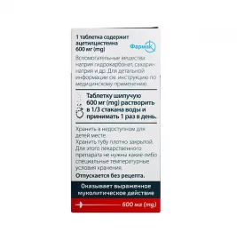 1 шипучая таблетка 600 мг содержит 8,4 ммоль (194,2 мг) натрия. Это необходимо учитывать, если пациент соблюдает диету с контролем потребления натрия.