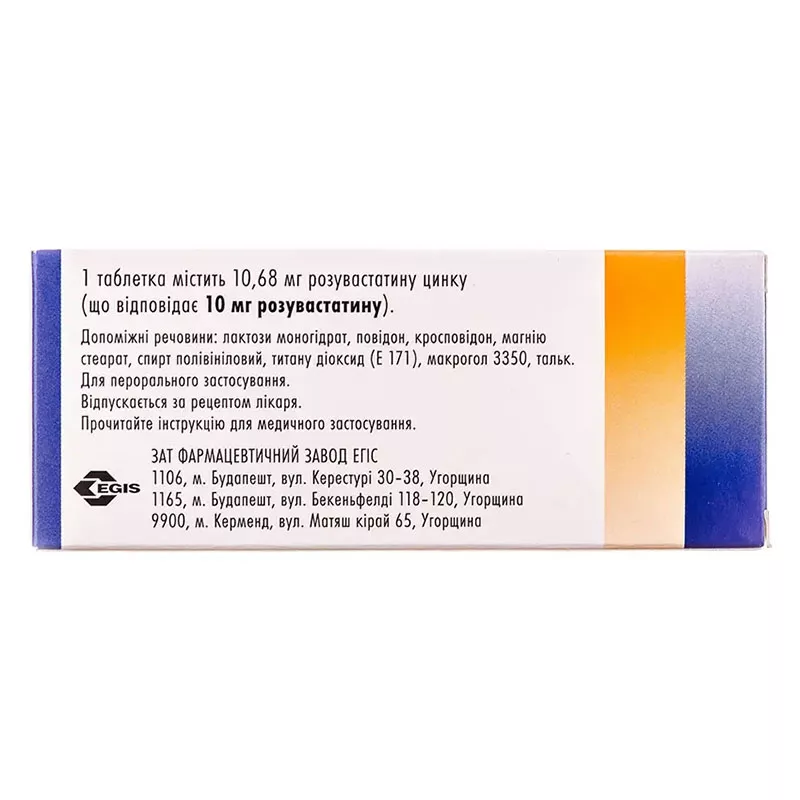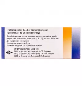 1 таблетка, покрытая пленочной оболочкой, содержит 5,34 мг или 10,68 мг, или 21,36 мг розувастатина цинка (что соответствует 5 мг или 10 мг или 20 мг розувастатина соответственно);