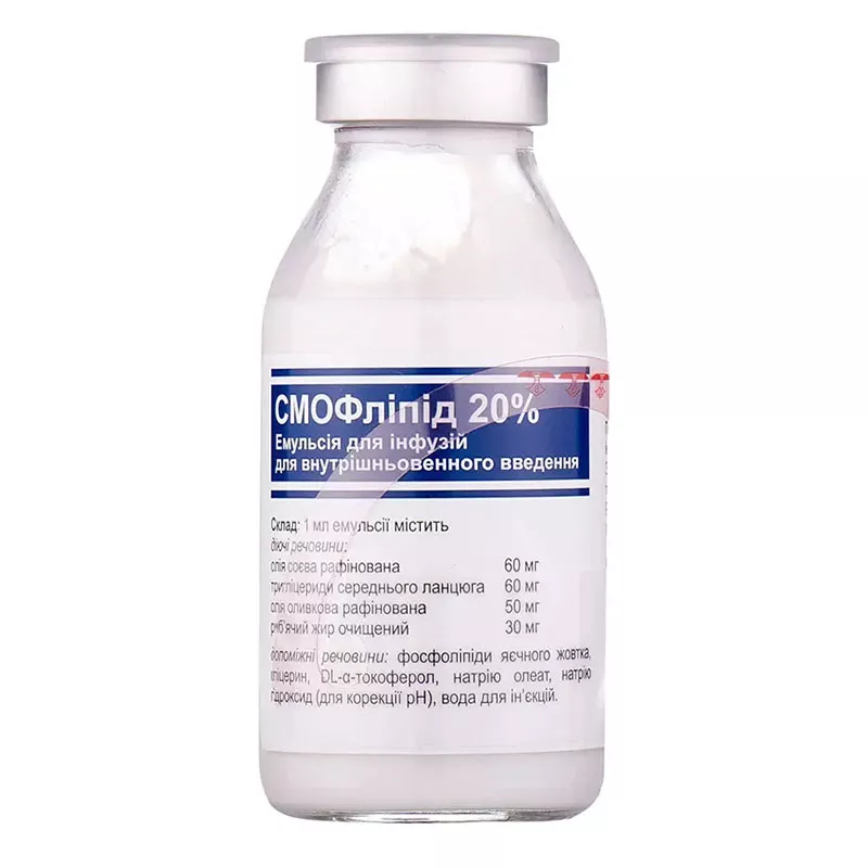 - Особенности Смофлипид 20\% 100 мл эмульсия Инструкция ІНСТРУКЦІЯ для медичного застосування препарату СМОФліпід 20 \% (SMOFlipid 20 \%) Склад: діючі речовини: 1000 мл розчину містять 60 г олії соєвої рафінованої, 60 г тригліцеридів середнього ланцюга, 50 г олії оливкової рафінованої, 30 г риб'ячого жиру очищеного; допоміжні речовини: фосфоліпіди яєчного жовтка, гліцерин, DL-?-токоферол, натрію олеат, натрію гідроксид (для корекції рН), вода для ін'єкцій. Лікарська форма. Емульсія для інфузій. Фармакотерапевтична група. Розчини для парентерального харчування. Жирові емульсії. Код АТС В05ВА02. Клінічні характеристики. Показання. СМОФліпід є джерелом енергії, незамінних жирних кислот і омега-3-жирних кислот для пацієнтів при парентеральному харчуванні, коли пероральне або ентеральне харчування неможливе, недостатнє або протипоказане. Протипоказання. Підвищена чутливість до риб'ячого, яєчного, соєвого білків або до будь-якої з діючих чи допоміжних речовин; тяжка гіперліпідемія; тяжка печінкова недостатність; тяжкі порушення згортання крові; тяжка ниркова недостатність без гемофільтрації або діалізу; гострий шок; загальні протипоказання до інфузійної терапії: гострий набряк легенів, гіпергідратація, декомпенсована серцева недостатність; нестабільний стан (наприклад, після тяжких травм, декомпенсованогоцукрового діабету, гострого інфаркту міокарда, інсульту, емболії, метаболічного ацидозу, тяжкого сепсису та гіпотонічної дегідратації). Спосіб застосування та дози. Внутрішньовенні інфузії в центральну або периферичну вени. Дорослі Стандартна доза становить 1-2 г жиру/кг ваги тіла на добу, що відповідає 5-10 мл/кг ваги тіла на добу. Рекомендована швидкість інфузії ?0,125 г жиру/кг ваги тіла/год, що відповідає 0,63 мл СМОФліпіду 20 \%/кг ваги тіла/год і не повинна перевищувати 0,15 г жиру/кг ваги тіла/год, що відповідає 0,75 мл СМОФліпіду 20 \%/кг ваги тіла/год. Новонароджені і немовлята. Початкова доза повинна становити 0,5-1 г жиру/кг ваги тіла на добу з наступним послідовним збільшенням на 0,5-1 г жиру/кг ваги тіла на добу. Рекомендується не перевищувати добову дозу ?3 г жиру/кг ваги тіла на добу, що відповідає 15 мл СМОФліпіду 20 \%/кг ваги тіла на добу. Швидкість інфузії не повинна перевищувати 0,125 г жиру/кг ваги тіла/год. Недоношеним та новонародженим немовлятам із низькою вагою СМОФліпід необхідно вводити безперервно протягом 24 годин. Діти Рекомендується не перевищувати добову дозу 3 г жиру/кг ваги тіла/добу, що відповідає 15 мл СМОФліпіду 20 \%/кг ваги тіла на добу. Добова доза повинна збільшуватись поступово протягом першого тижня. Швидкість інфузії не повинна перевищувати 0,15 г жиру/кг ваги тіла/год. Побічні реакції. Після застосування препарату спостерігалися побічні реакції з такою частотою: дуже часто (>1/10;) часто (>1/100,<1/10); нечасто (>1/1000,<1/100); рідко (>1/10000,<1/1000); дуже рідко (<1/10000). З боку органів дихання: Рідко: задишка. З боку травної системи: Нечасто: відсутність апетиту, нудота, блювання. З боку судинної системи: Рідко: артеріальна гіпотензія, гіпертензія. Загальні побічні реакції та реакції у місці введення: Часто: незначне збільшення температури тіла. Нечасто: відчуття холоду. Рідко: реакції гіперчутливості (анафілактичні реакції, шкірні висипи, уртикарія, почервоніння, головний біль), відчуття жару або холоду, блідість, ціаноз, біль у шиї, спині, кістках, грудях та попереку. 