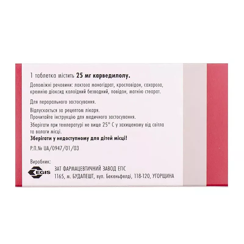 1 таблетка містить 6,25 мг або 12,5 мг, або 25 мг карведилолу;