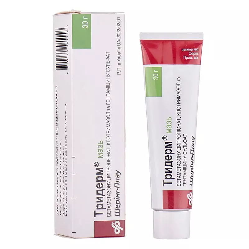 - Особенности Инструкция ІНСТРУКЦІЯ для медичного застосування лікарського засобу ТРИДЕРМ® (TRIDERM®) Склад: діючі речовини: 1 г мазі містить: бетаметазону дипропіонату еквівалентно бетаметазону 0,5 мг, клотримазолу 10 мг та гентаміцину сульфату еквівалентно гентаміцину 1 мг; допоміжні речовини: олія мінеральна, парафін білий м'який. Лікарська форма. Мазь. Основні фізико-хімічні властивості: м’якої консистенції від білого до світло-жовтого кольору однорідна мазь без сторонніх домішок. Фармакотерапевтична група. Кортикостероїди для застосування у дерматології. Кортикостероїди у комбінації з антибіотиками. Бетаметазон і антибіотики. Код АТХ D07С C01. Фармакологічні властивості. Фармакодинаміка. Тридерм® поєднує в собі протизапальну, протисвербіжну та судинозвужувальну дію бетаметазону дипропіонату з широкою антимікотичною дією клотримазолу та широким спектром антибактеріальної активності гентаміцину сульфату. Клотримазол чинить протигрибкову дію на клітинну мембрану грибів, призводячи до витоку клітинного вмісту. Клотримазол забезпечує ефективну дію проти дерматофітів, дріжджових та плісневих грибків, таких як Trichophyton rubrum, Trichophyton mentagrophytes, Epidermophyton floccosum, Microsporum canis та Candida (включаючи Candida albicans) Гентаміцин забезпечує високоефективне місцеве лікування первинних та вторинних бактеріальних інфекцій шкіри. Гентаміцин активний відносно Staphylococcus aureus, Staphylococcus epidermidis (коагулазо-позитивні, коагулазонегативні і деякі штами, які продукують пеніциліназу) та грамнегативних бактерій: Pseudomonas aeruginosa, Haemophilus influenzae, Moraxella lacunata, Neisseria, Serratia, Escherichia coli, Proteus vulgaris. Фармакокінетика. Дані про фармакокінетику препарату Тридерм® відсутні. Клінічні характеристики. Показання. Лікування дерматозів, чутливих до кортикостероїдів, при наявності (або при підозрі) бактеріальних та/або грибкових інфекцій, які спричинені чутливими до компонентів препарату мікроорганізмами. Протипоказання. Протипоказанням для місцевого застосування кортикостероїдів є інфекції шкіри [вірусного, бактеріального (у тому числі ТБ) та грибкового походження], шкірні реакції після вакцинації, шкірні виразки та вугрі. Не рекомендується наносити мазь при наявності розацеа або періорального дерматиту. Препарат протипоказаний пацієнтам із підвищеною чутливістю до активних речовин або до будь-якого іншого компонента препарату, інших аміноглікозидних антибіотиків (перехресні алергічні реакції на гентаміцин) або похідних імідазолу (перехресні алергічні реакції на клотримазол). Тридерм® не показаний для використання під оклюзійними пов'язками. Тридерм® не слід наносити на слизові оболонки, очі або ділянку біля очей. Взаємодія з іншими лікарськими засобами та інші види взаємодій. При застосуванні мазі на шкірі статевих органів та анальній ділянці наявність парафіну м'якого або парафіну рідкого (допоміжні речовини у складі препарату) може зменшити міцність на розрив латексних презервативів, чим знижує їх надійність при використанні. Клотримазол при місцевому застосуванні може бути антагоністом амфотерицину та інших полієнових антибіотиків. Особливості застосування. При розвитку подразнення шкіри або проявів підвищеної чутливості на тлі лікування маззю Тридерм® застосування препарату слід припинити і підібрати хворому адекватну терапію. При місцевому застосуванні системна