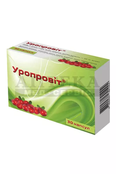 - Особенности СКЛАД: 1 капсула “Уропровіт” містить; АКТИВНІ ІНГРЕДІЄНТИ Екстракт журавлини — 250 мг, Екстракт толокнянки (Мучниці) — 100 мг, Екстракт хвоща польового — 100 мг; допоміжні речовини: наповнювачі: діоксид кремнію аморфний (орісіл), мікрокристалічна целюлоза, кальцію стеарат, лактоза; оболонка капсули: желатин. Поживна (харчова) та енергетична цінність (калорійність) на 100 г добавки: білки — 15,0 г, вуглеводи — 1,1 г, жири — 0 г; 64,4 ккал (269,4 кДж). РЕКОМЕНДАЦІЇ ДО СПОЖИВАННЯ: як додаткове джерело біологічно активних речовин рослинного походження. Сприяє нормалізації функціонування сечовивідної системи. “Уропровіт” може бути рекомендований для полегшення процесу інфекційно-запальних захворювань сечовивідної системи, таких як цистит, простатит, пієлонефрит та уретрит; Збільшення протимікробної дії проти збудників інфекції; Профілактики утворення сечового або ниркового каменю.