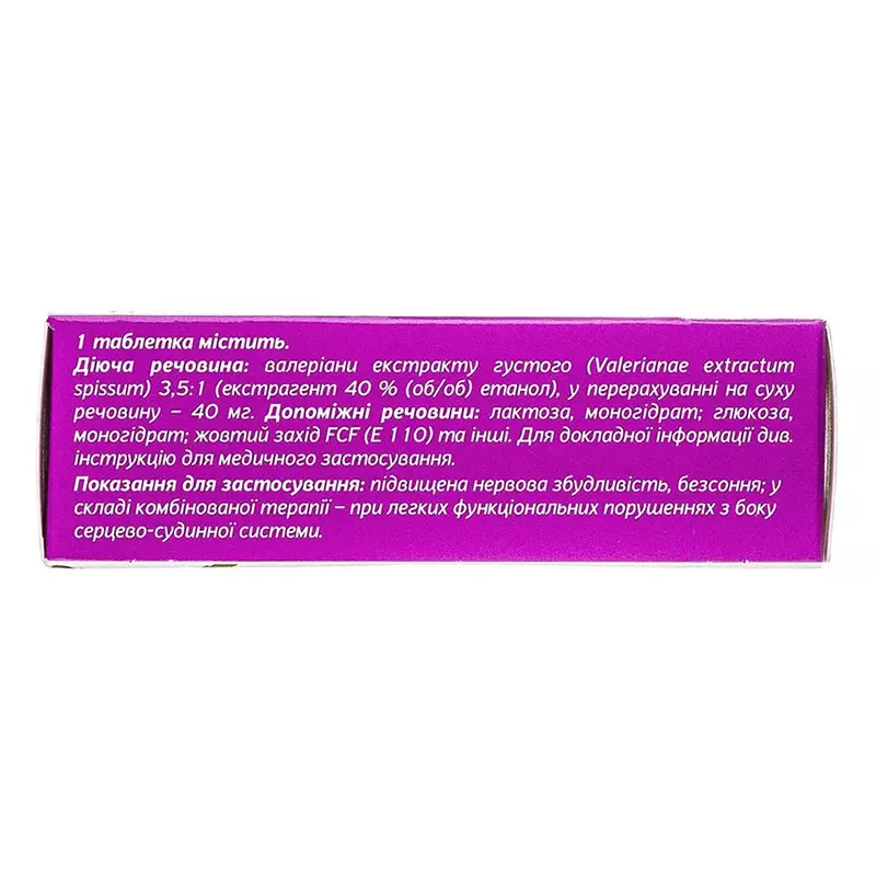 Действующее вещество: 1 таблетка содержит валерианы экстракта густого (Valerianae extractum spissum) 3,5: 1 (экстрагент 40% (об/об) этанол) в пересчете на сухое вещество - 40 мг;