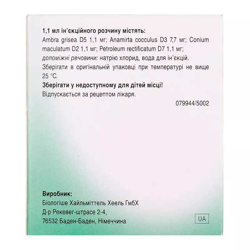 Действующие вещества: 1,1 мл раствора содержат: Ambra grisea D5 - 1,1 мг; Anamirta cocculus D3 - 7,7 мг; Сonium maculatum D2 - 1,1 мг; Petroleum rectificatum D7 - 1,1 мг;