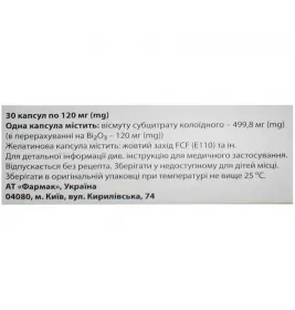 Одна капсула содержит висмуту коллоидного субцитрата 499,8 мг в пересчете на Ви2О3 120 мг;