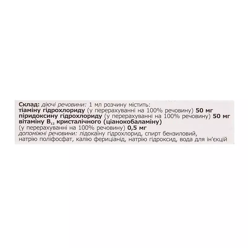 1 мл раствора содержит тиамина гидрохлорида (в пересчете на 100 % вещество) 50 мг, пиридоксина гидрохлорида (в перечислении на 100% вещество) 50 мг, цианокобаламина (в пересчете на 100 % вещество) 0,5 мг;