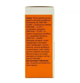 Действующие вещества: 100 мл капель содержат водного субстрата метаболитов: Escherichia coli, DSM 4087 - 24,9481 г, Enterococcus faecalis, DSM 4086 - 12,4741 г, Lactobacillus acidophilus, DSM 4149 - 12,4741 г та водного концентрату метаболітів: Lactobacillus helveticus, DSM 4183 – 49,8960 г;