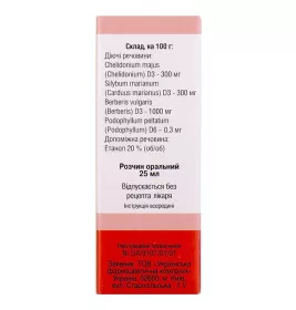 Действующие вещества:Chelidonium majus (Chelidonium) D3, Silybum marianum (Carduus marianus) D3, Berberis vulgaris (Berberis) D3, Podophyllum peltatum (Podophyllum) D6;
