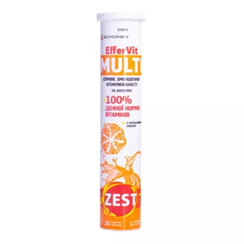 ЗЕСТ ЭфферВит Мульти способствует уменьшению усталости, нормальному течению энергетического метаболизма, функционированию нервной и иммунной систем, защите клеток от оксидативного стресса за счет 100% дневной нормы витаминов (согласно Reg. EU 1169/2011) С, E, B6, B2, B1, B12, B5, B9, H, PP в составе.